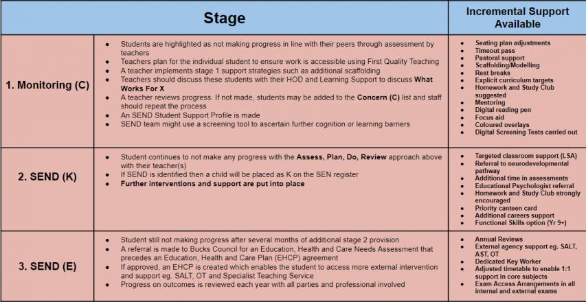 Students have a lead role to play in meetings about their progress. Each student on the Concern list and SEND Register has an individualised SEN Support Pupil Profile that is shared with teaching and support staff to ensure they have the support that is right for them.